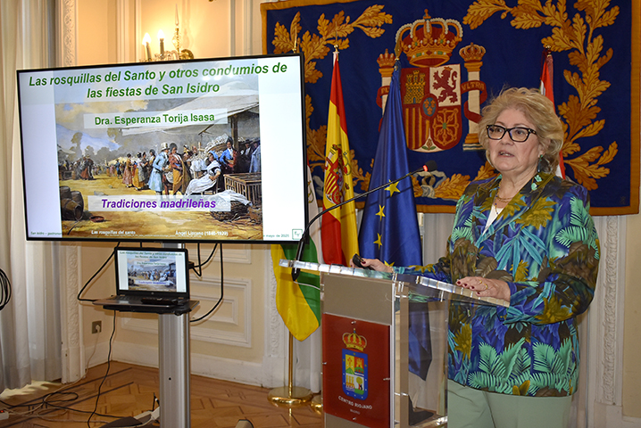 El día 20 de mayo en el Salón La Lengua fue impartida la conferencia “LAS ROSQUILLAS DEL SANTO Y OTROS CONDUMIOS DE LAS FIESTAS DE SAN ISIDRO”, a cargo de Esperanza Torija Isasa, Catedrática de Nutrición y Bromatología y Doctora en Farmacia. Presentó el acto Gloria Martínez-Manso, vicepresidenta del Centro Riojano de Madrid.