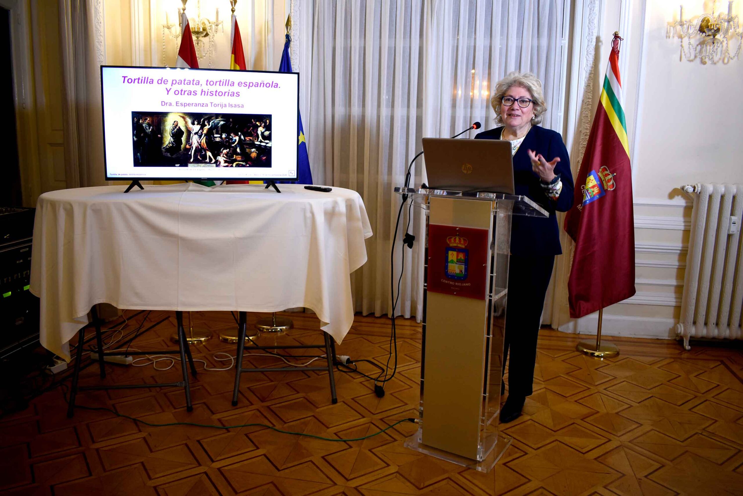 En el Salón La Lengua del Centro Riojano de Madrid, ha tenido lugar la Conferencia “TORTILLA DE PATATA, TORTILLA ESPAÑOLA. Y OTRAS HISTORIAS” A cargo de Esperanza Torija Isasa, Doctora en Farmacia y Catedrática de nutrición y bromatología. Presentada por Gloria Martínez-Manso, vicepresidenta del Centro Riojano de Madrid.