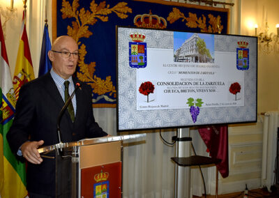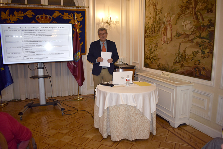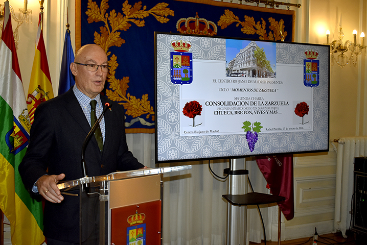 El pasado martes 27 de enero se celebró en el Salón La Lengua la conferencia titulada «La zarzuela en la segunda mitad del siglo XIX (segunda parte)». Durante el encuentro, el ponente Rafael Parrilla profundizó en la evolución y las claves de este género lírico durante dicho periodo histórico. El acto fue presentado por Luis Fernando Leza Campos, Vocal de enología del Centro Riojano de Madrid, y contó con la presidencia de José Antonio Rupérez Caño, Presidente de la institución.